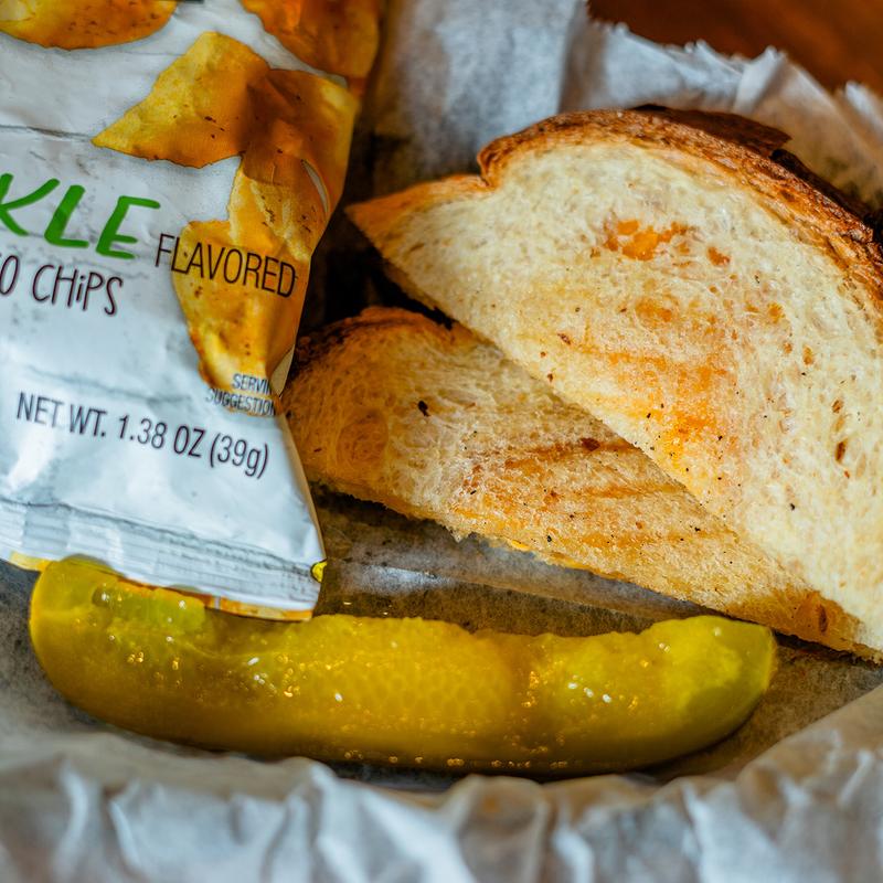 Served on grilled sourdough bread with a pickle spear and bag of chips.